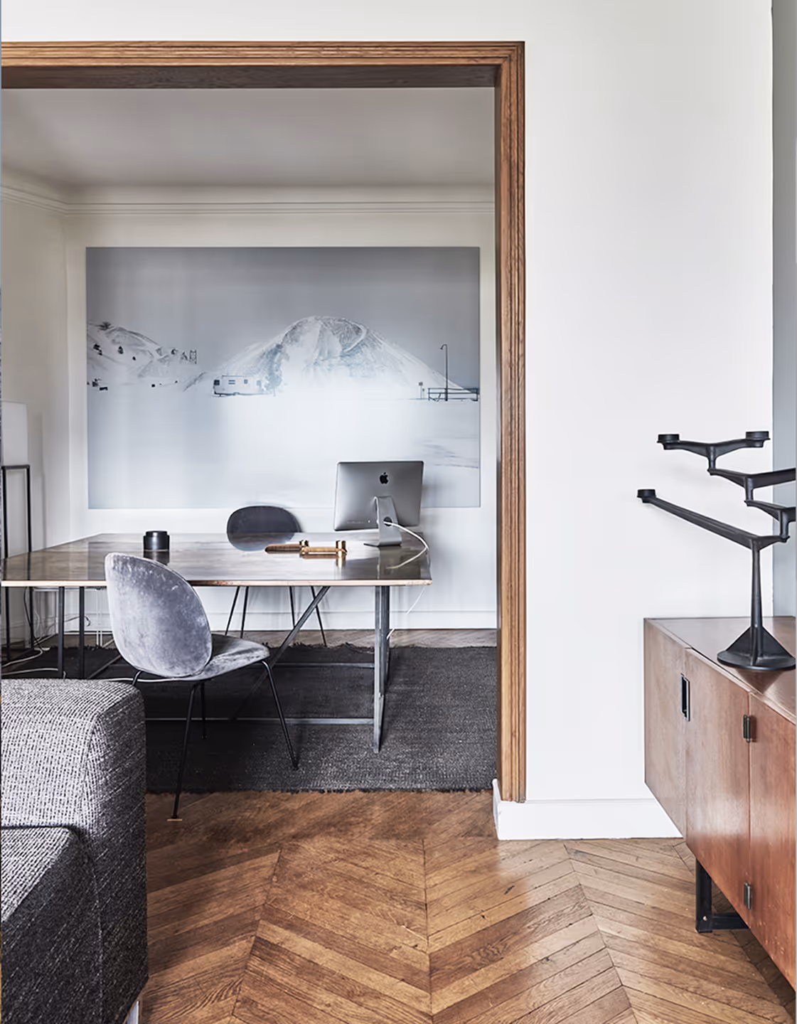 " Des détails retro - tels que les interrupteurs et poignées en porcelaine, baignoire vintage, carreaux de ciment – apportent une touche art deco répondant à l’esprit des parties communes; le mix équilibré entre le mobilier d’éditeur et les pièces chinées apporte une intemporalité ; des photos et œuvres d’art, sélectionnées avec le propriétaire au fil des années, ajoutent du caractère … cet appartement dégage une harmonie chaleureuse, un charme très contemporain. "