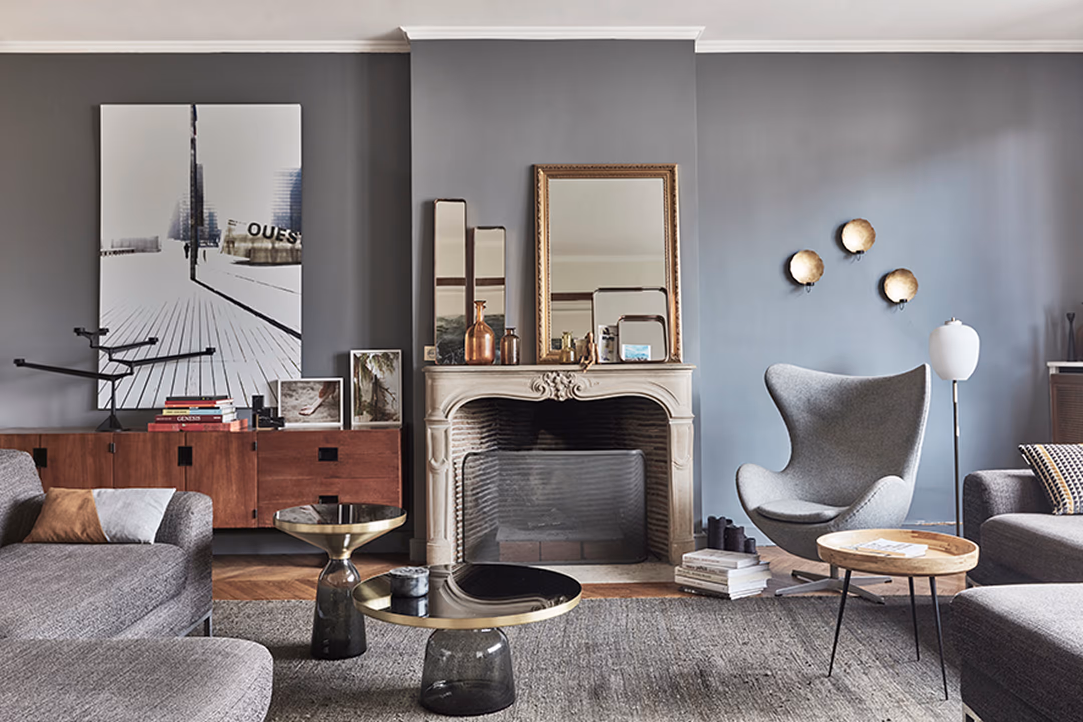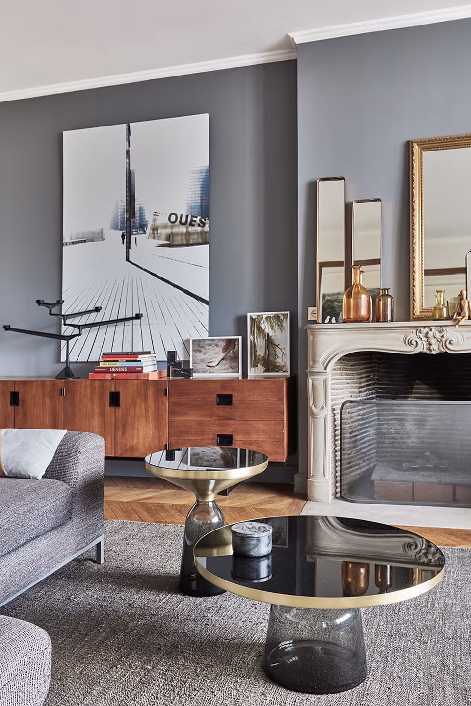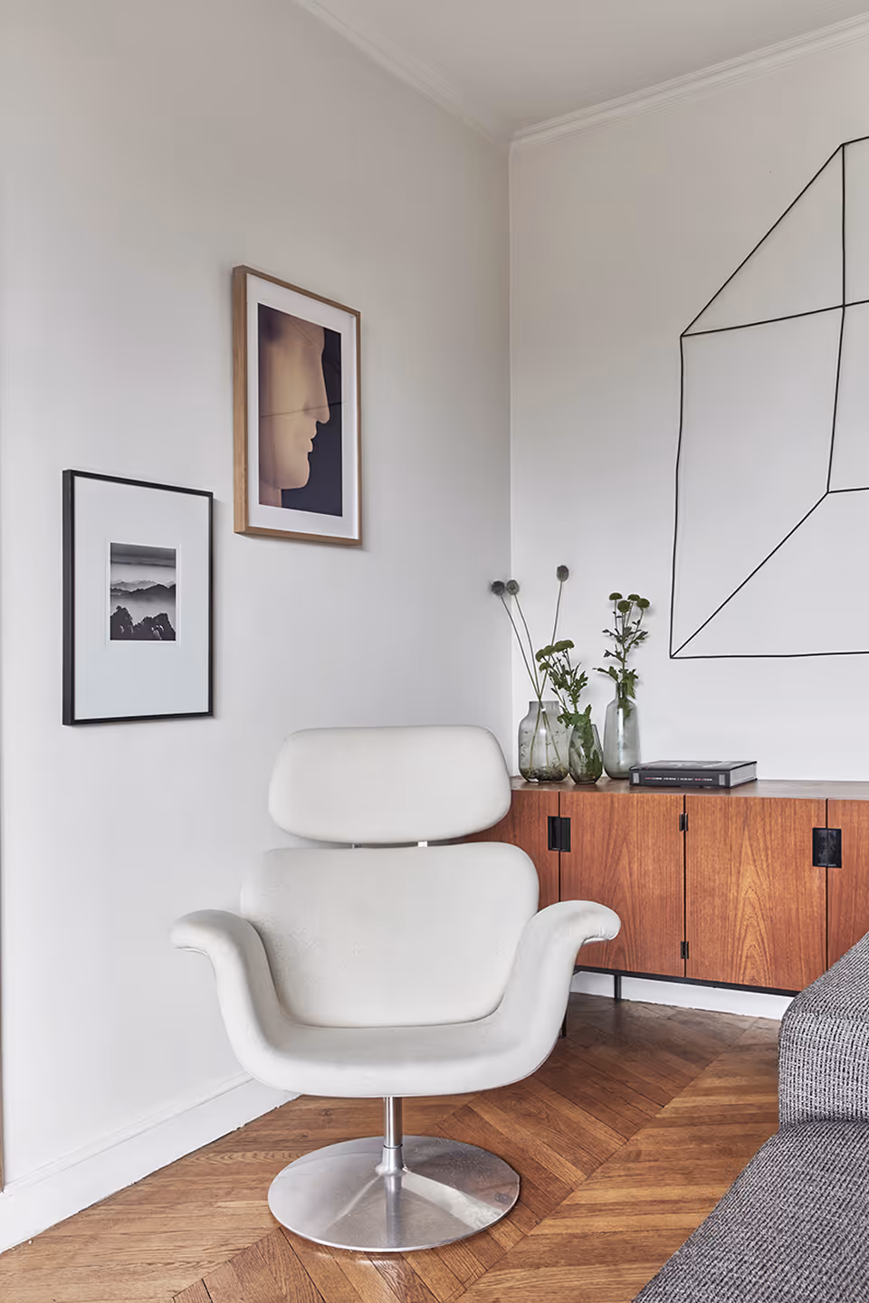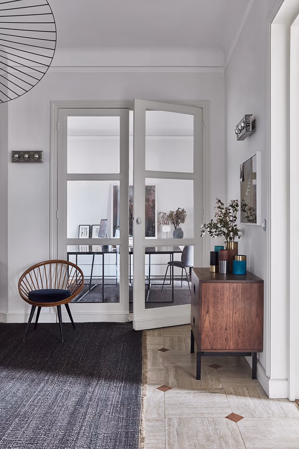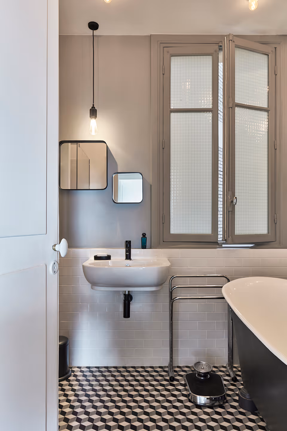 " Des détails retro - tels que les interrupteurs et poignées en porcelaine, baignoire vintage, carreaux de ciment – apportent une touche art deco répondant à l’esprit des parties communes; le mix équilibré entre le mobilier d’éditeur et les pièces chinées apporte une intemporalité ; des photos et œuvres d’art, sélectionnées avec le propriétaire au fil des années, ajoutent du caractère … cet appartement dégage une harmonie chaleureuse, un charme très contemporain. "