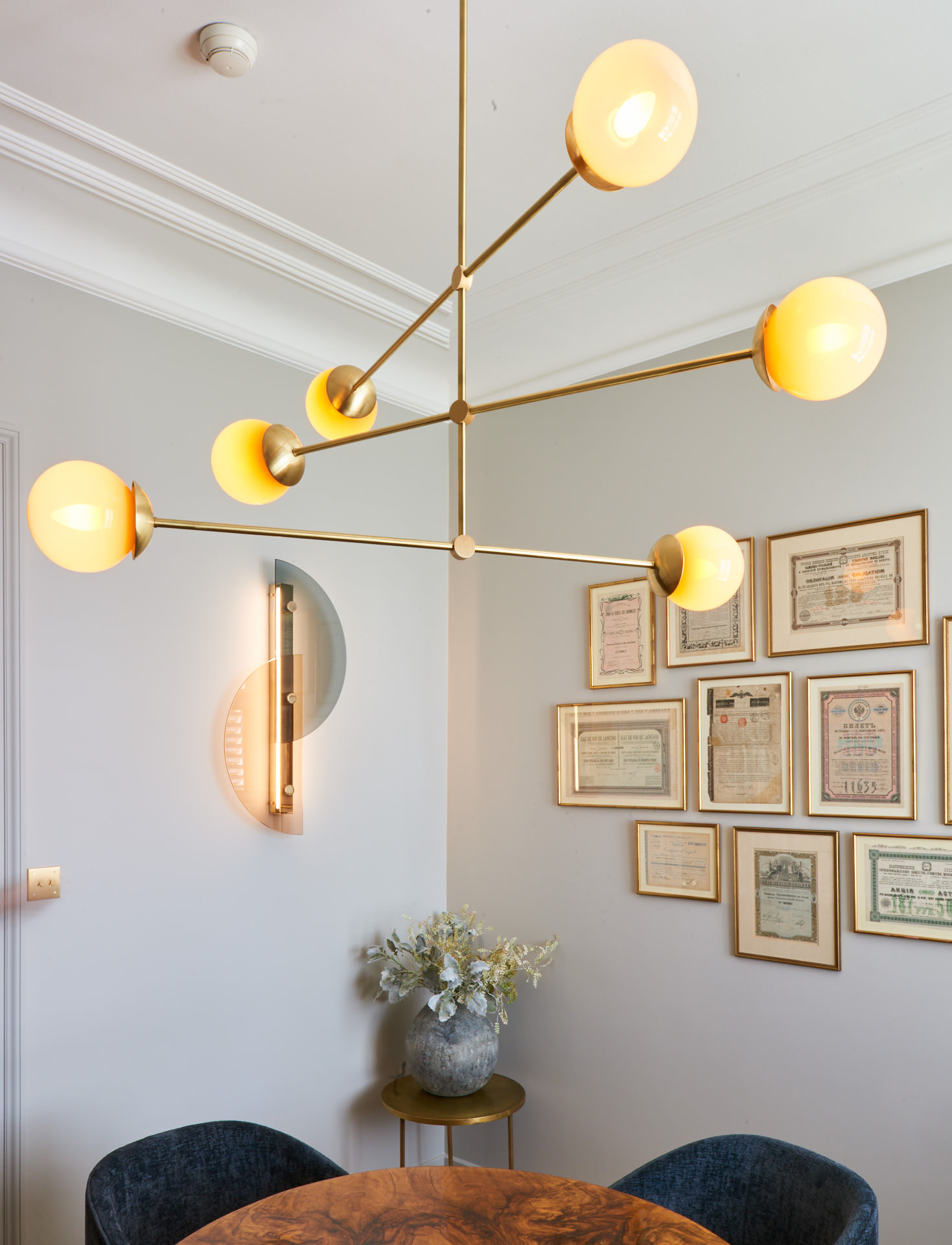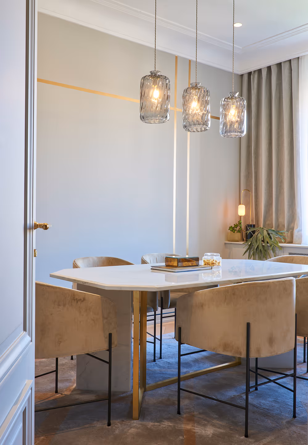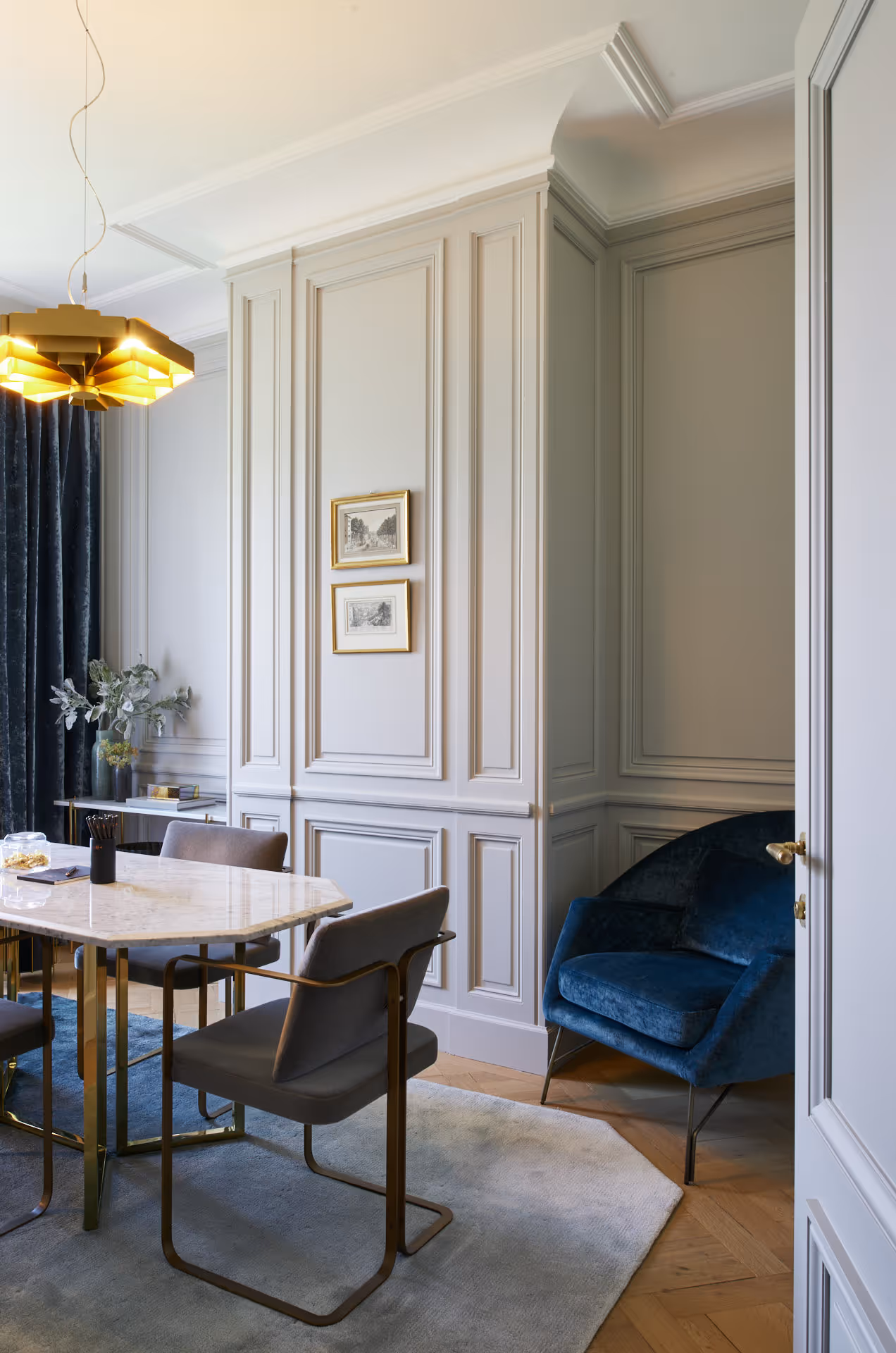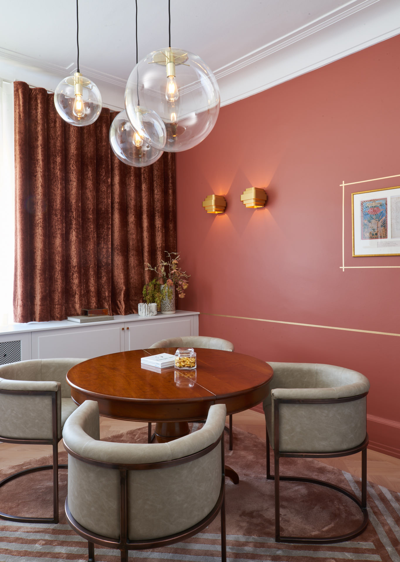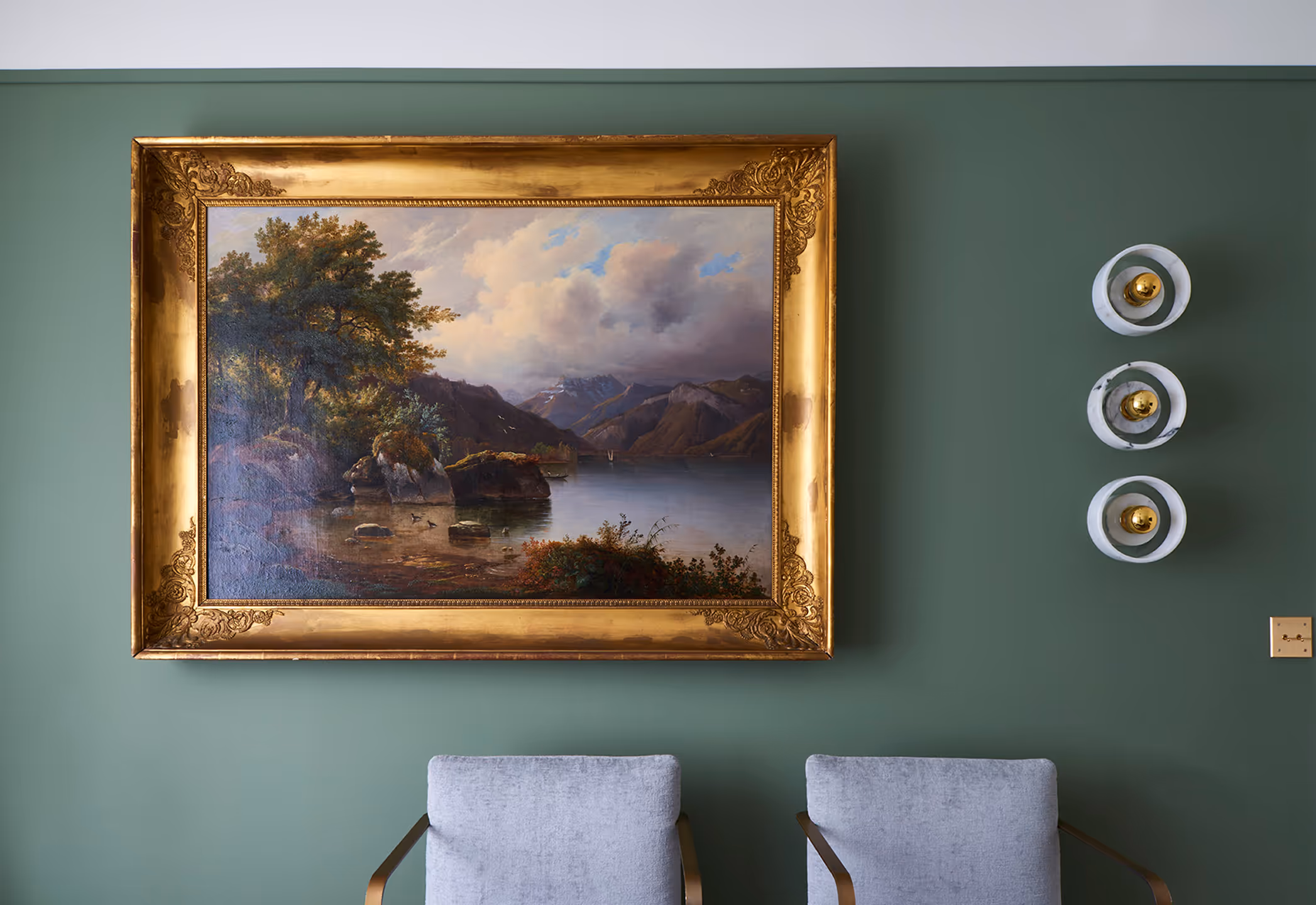 " Chaque salle de réunion est pensée comme un salon privé avec mobilier, tapis et accessoires sur mesure où le banquier puisse accueillir ses clients comme chez soi. Chaque salon a ses propres couleurs et jeux de lumière. La modernité de la mise en scène des peintures classiques met en valeur celles-ci. "