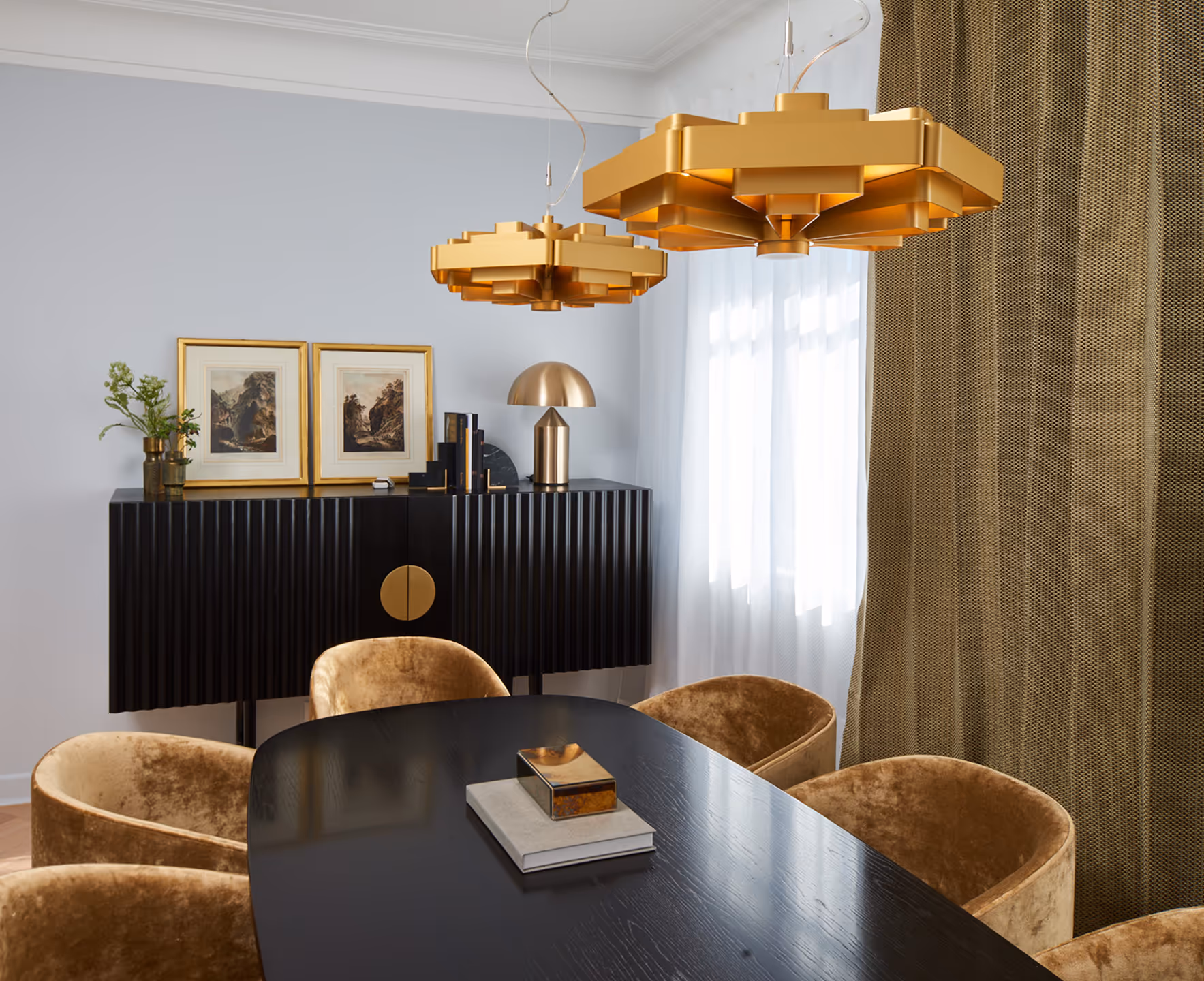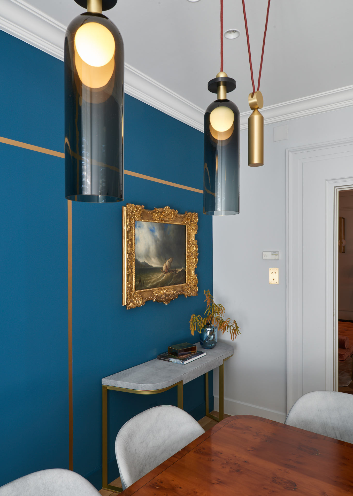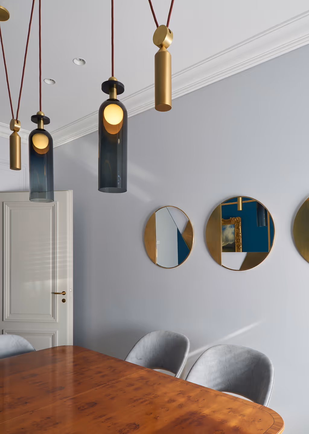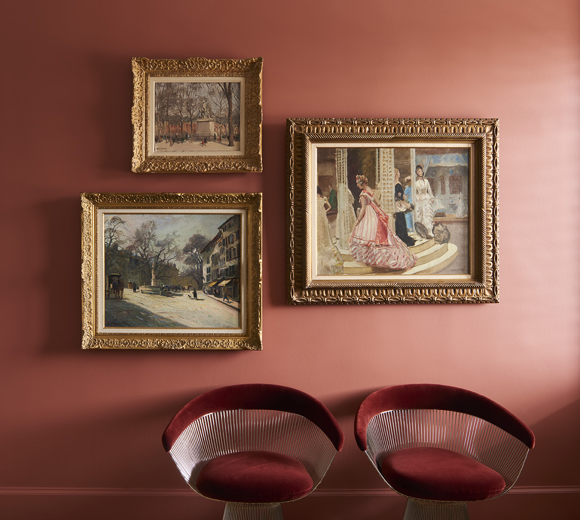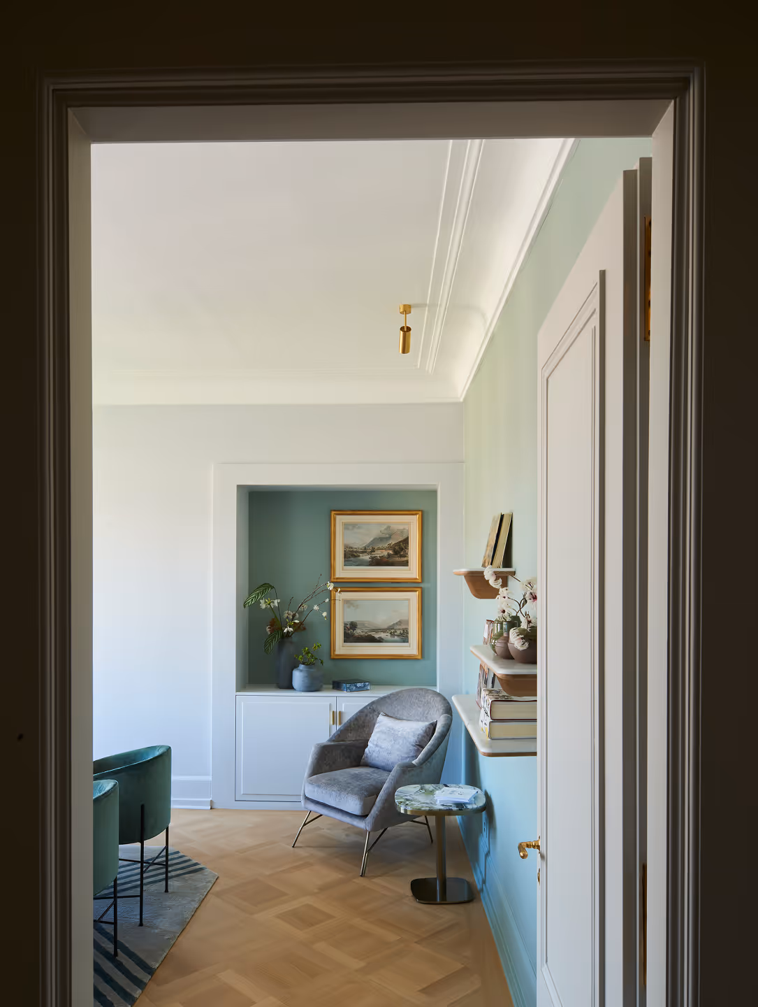 " Chaque salle de réunion est pensée comme un salon privé avec mobilier, tapis et accessoires sur mesure où le banquier puisse accueillir ses clients comme chez soi. Chaque salon a ses propres couleurs et jeux de lumière. La modernité de la mise en scène des peintures classiques met en valeur celles-ci. "