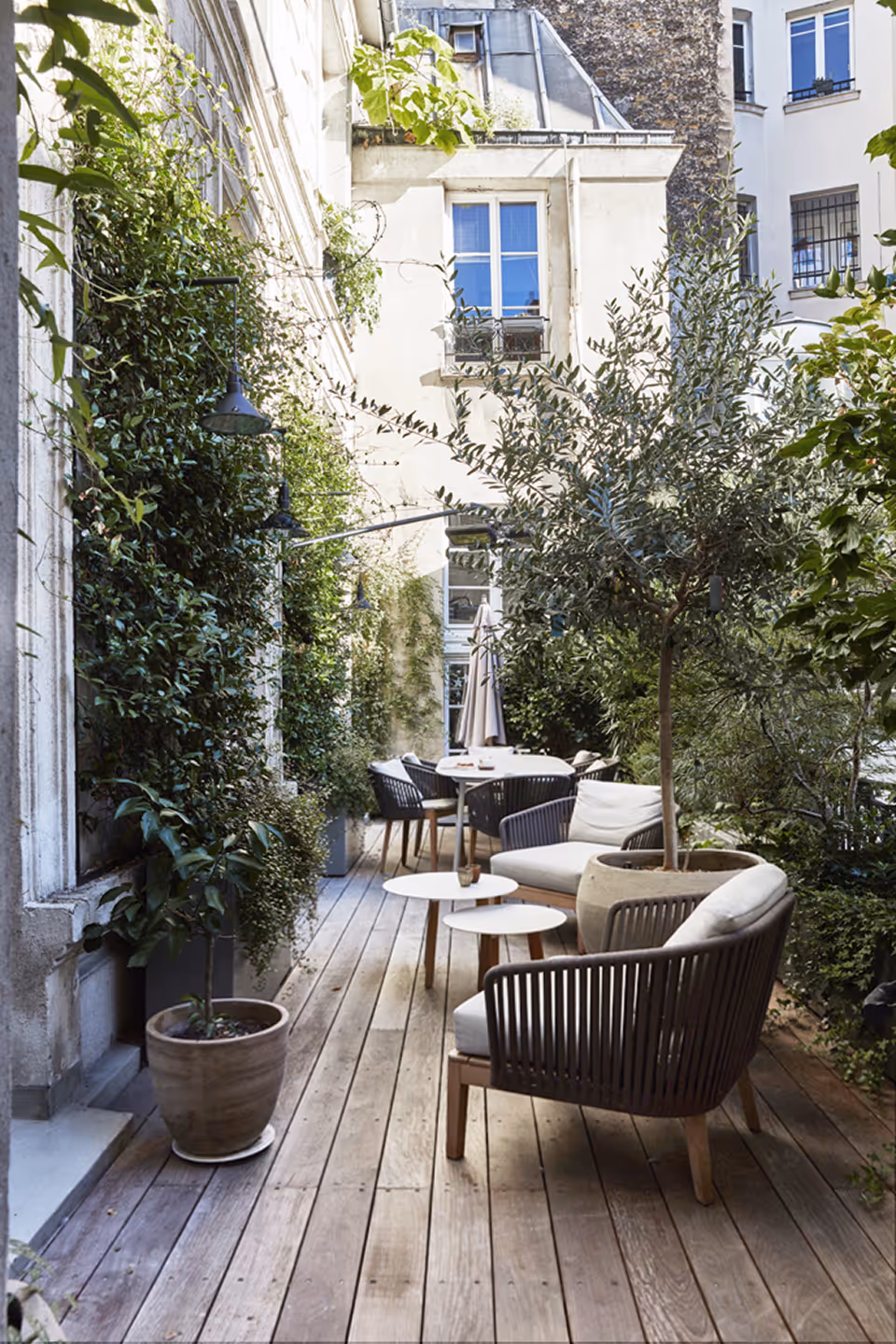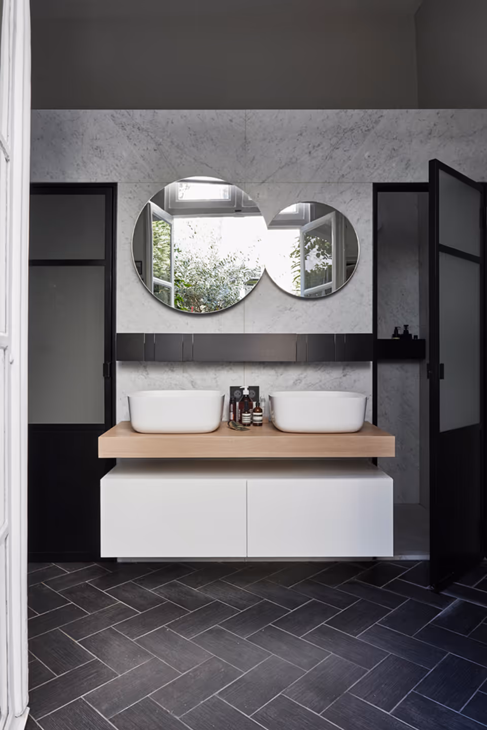 " En déplaçant la cuisine dans l’espace vie et en créant un dressing double hauteur dans la chambre parentale, une aile entière de l’appartement se libère pour créer les chambres et salle de bain des enfants. Le parquet XXL en bois brut, les couleurs élégantes, la modernité des lignes, les matières naturelles et les jeux de lumière donnent caractère et intimité à ce lieu unique. "