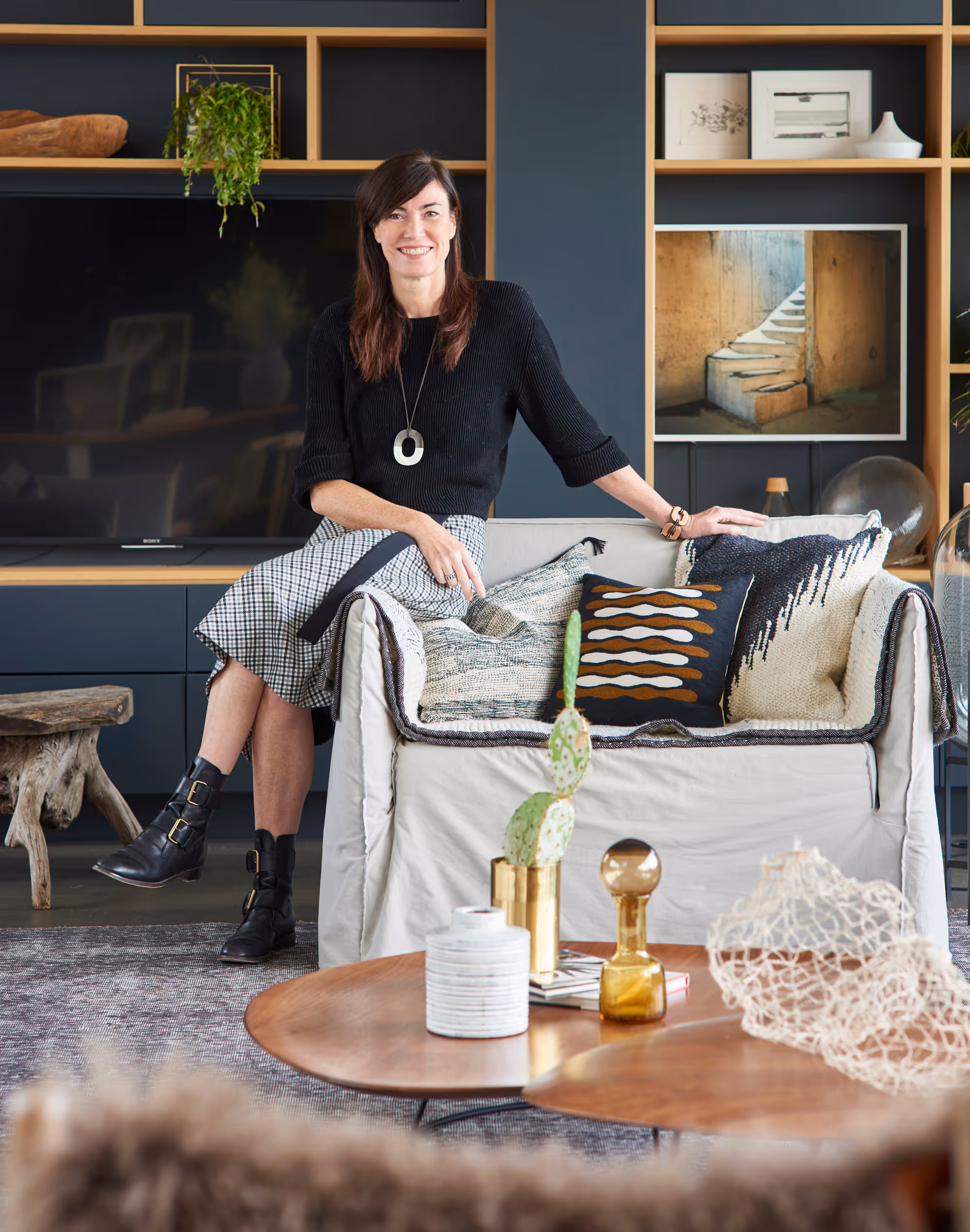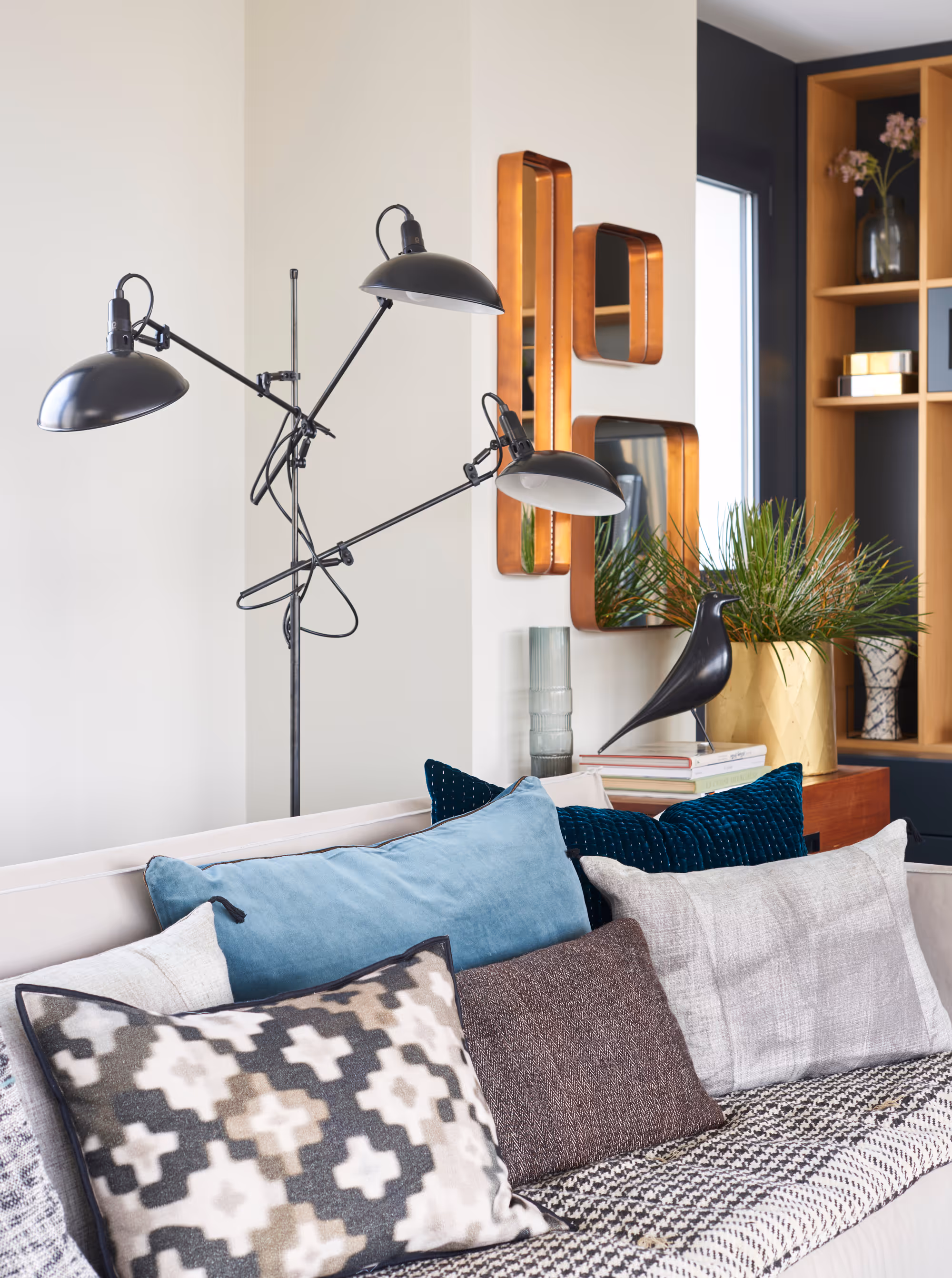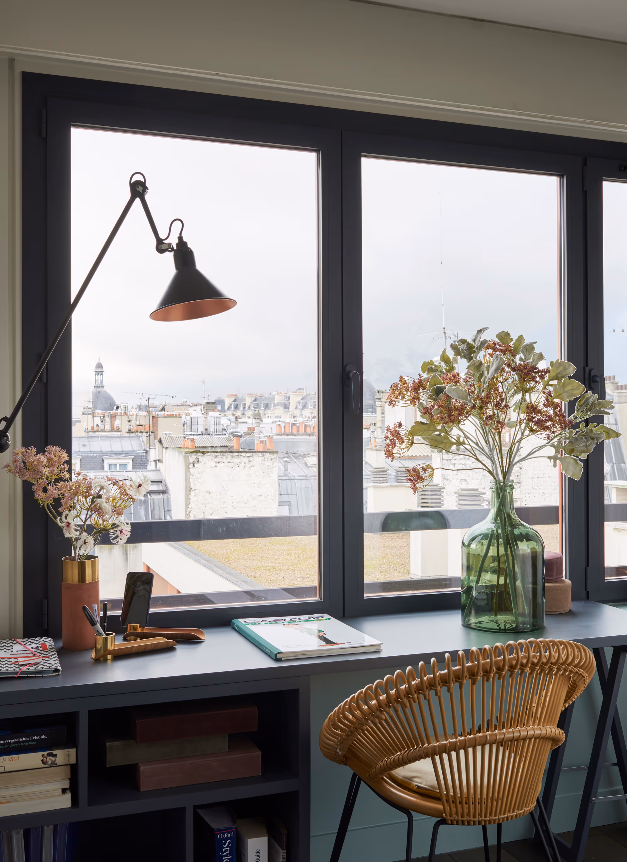 " Pour faire écho à la belle terrasse attenant à l’appartement et accompagner le goût des propriétaires qui n’aiment pas l’ostentatoire, ce duplex a été pensé comme une maison de vacances en plein Paris… Le bois texturé des menuiseries, les teintes naturelles des papiers peints et peintures, le confort tactile des coussins et tapis… l’ensemble apporte du charme et un luxe discret à ce duplex, qui invite à la détente. "