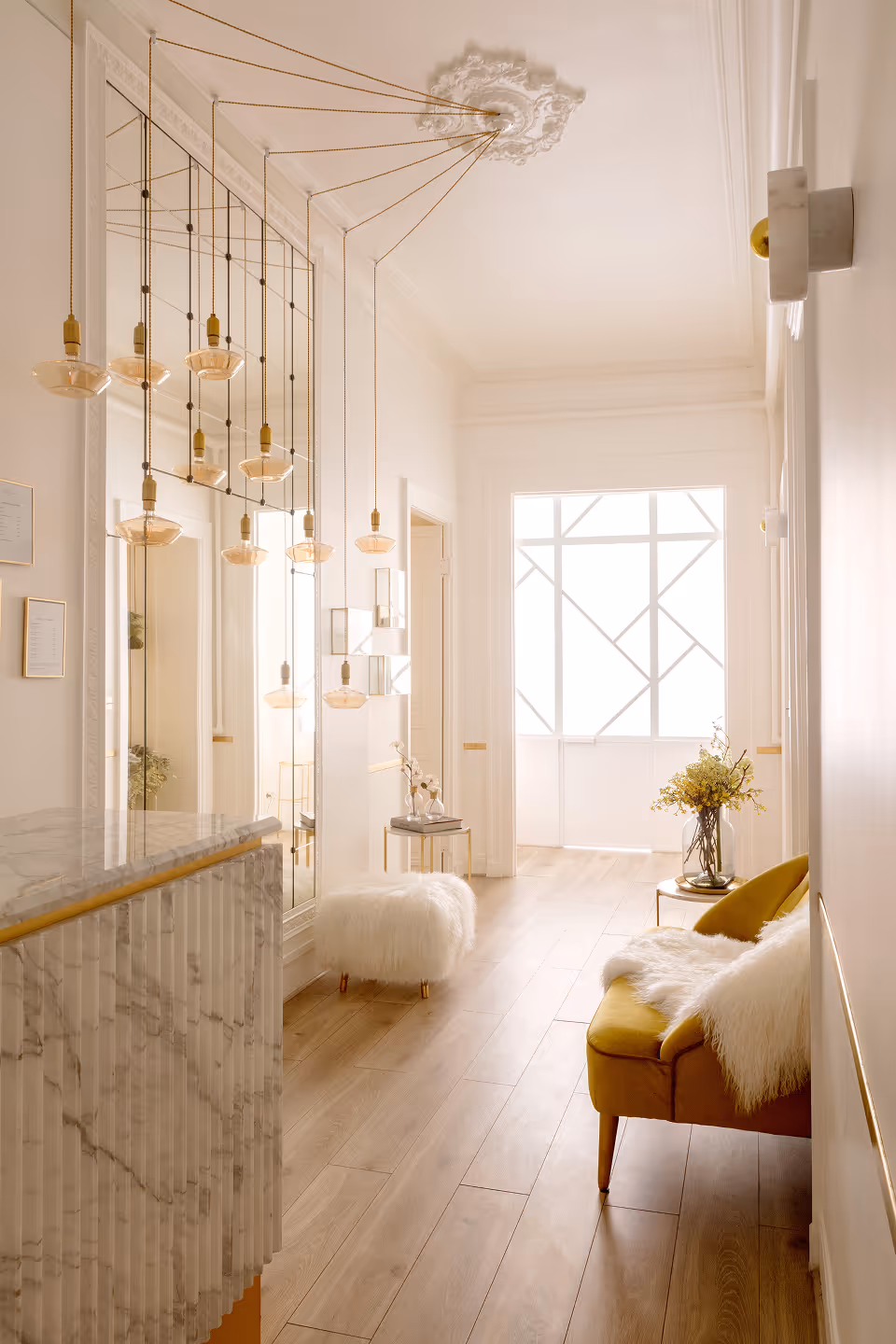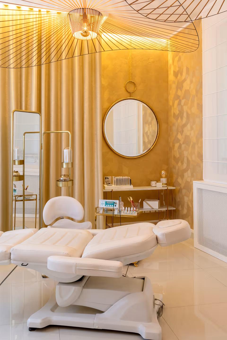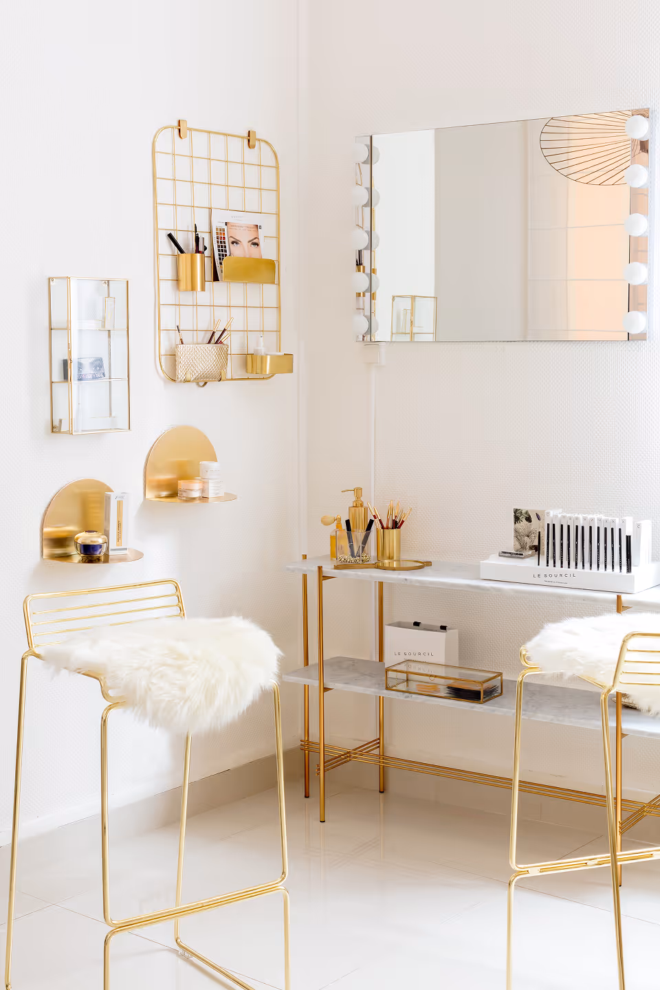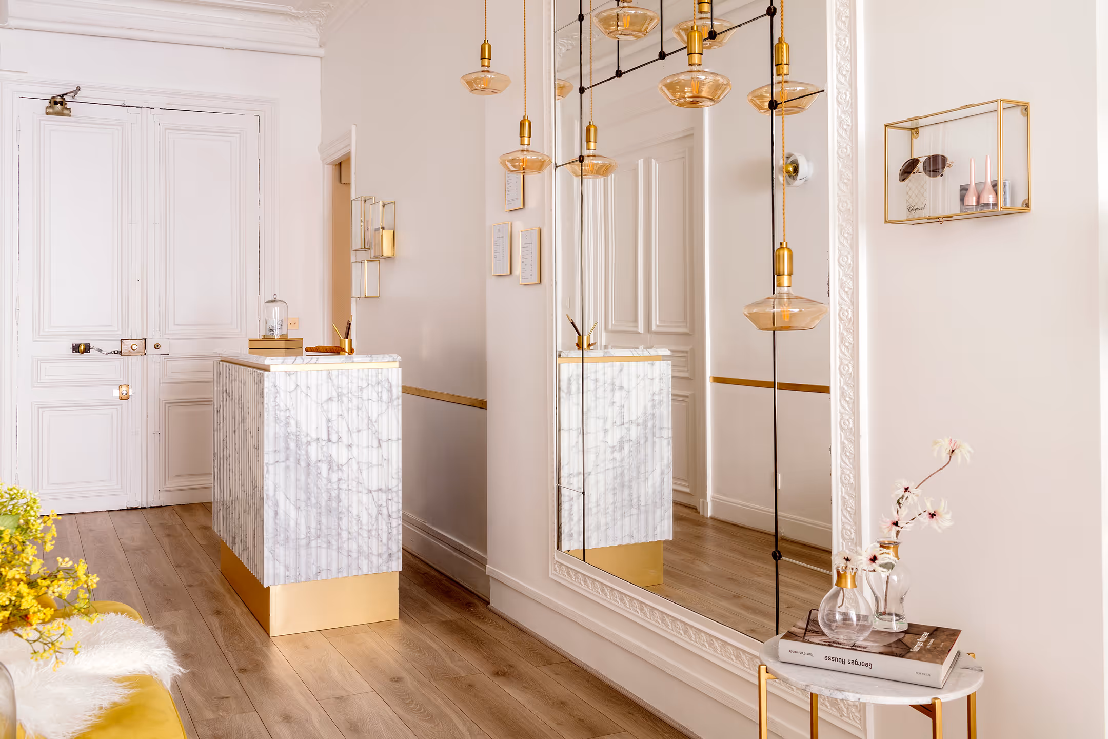 " Le raffinement des couleurs et matières exprime le positionnement exclusif de l’institut. Du mobilier sur mesure en marbre et laiton, une allure de boudoir années 30, du blanc avec des touches d’or, des miroirs et accessoires choisis avec précision… féminité et sérénité sont au rendez-vous… "