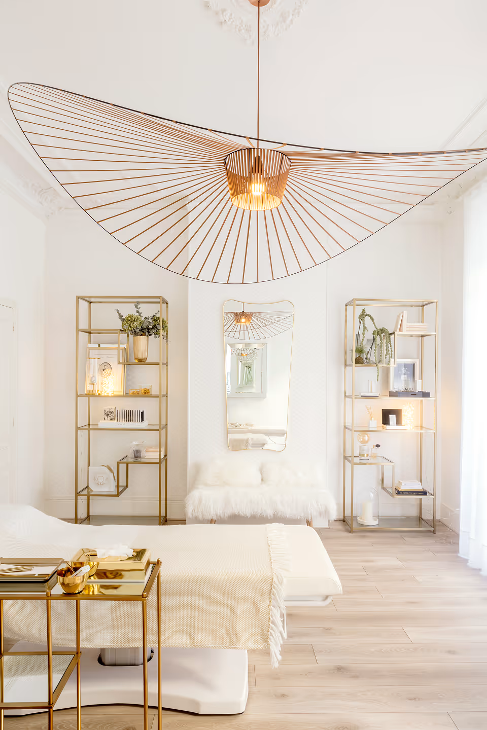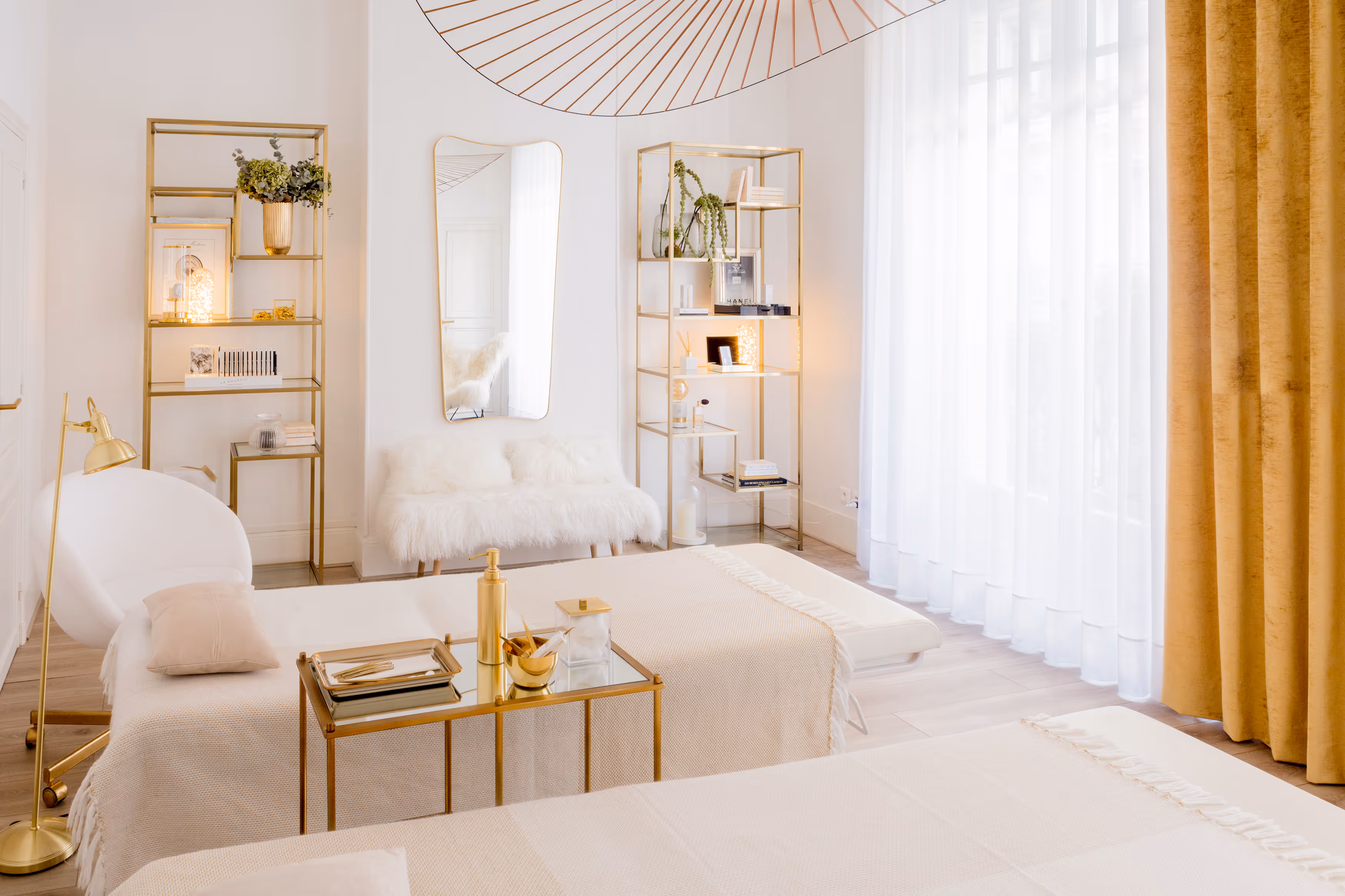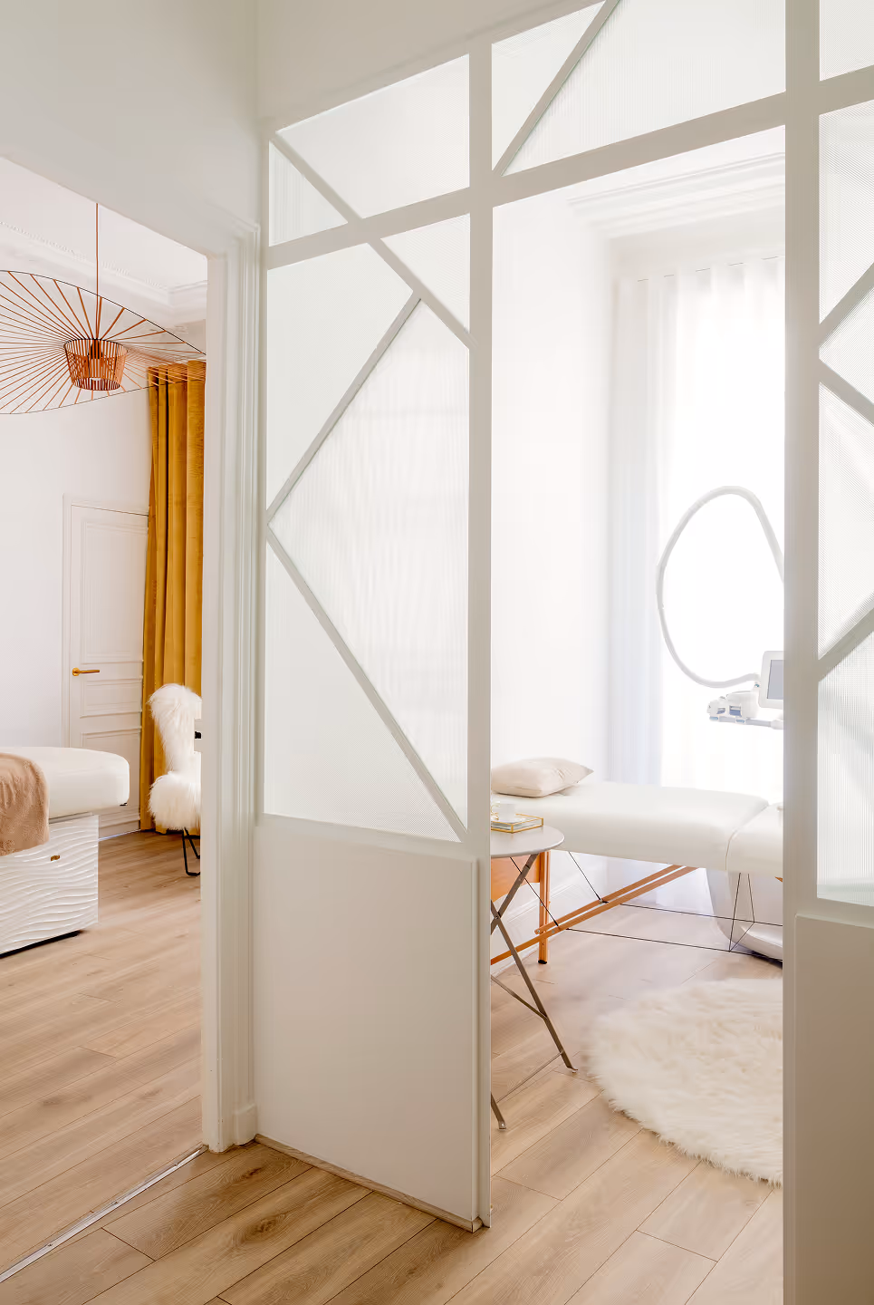 " Le raffinement des couleurs et matières exprime le positionnement exclusif de l’institut. Du mobilier sur mesure en marbre et laiton, une allure de boudoir années 30, du blanc avec des touches d’or, des miroirs et accessoires choisis avec précision… féminité et sérénité sont au rendez-vous… "