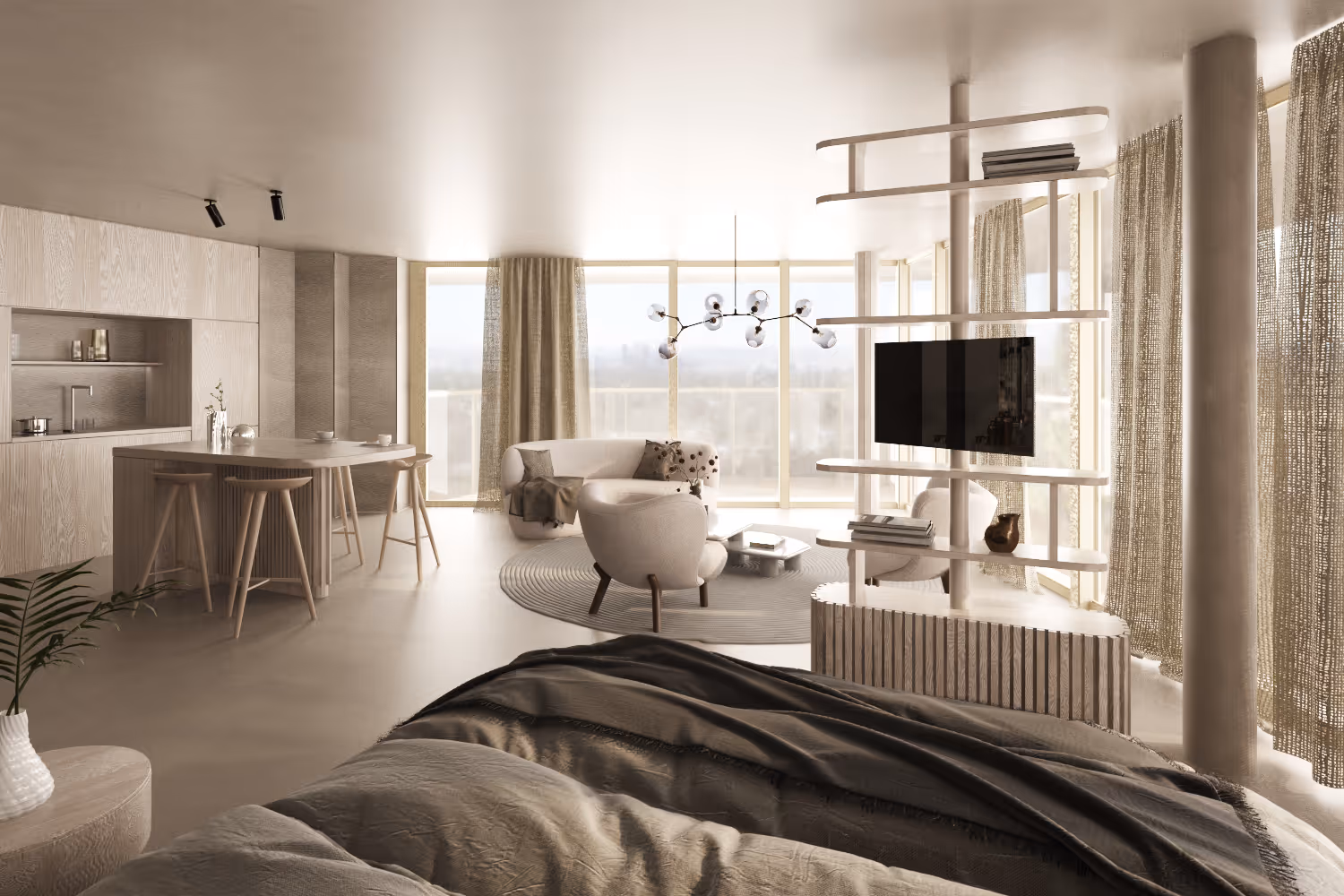 Le challenge : concevoir dans cette construction neuve une quarantaine de chambres à louer comme chambres d’hôtel ou comme mini-studios de vacances avec espace cuisine-repas.