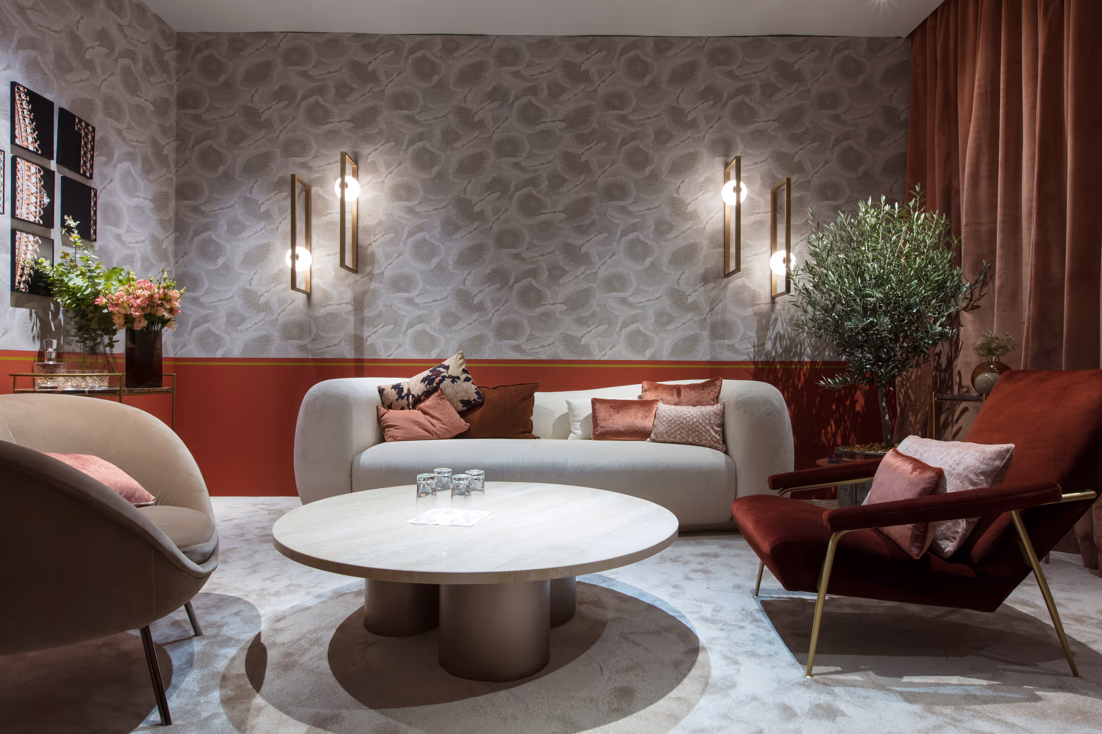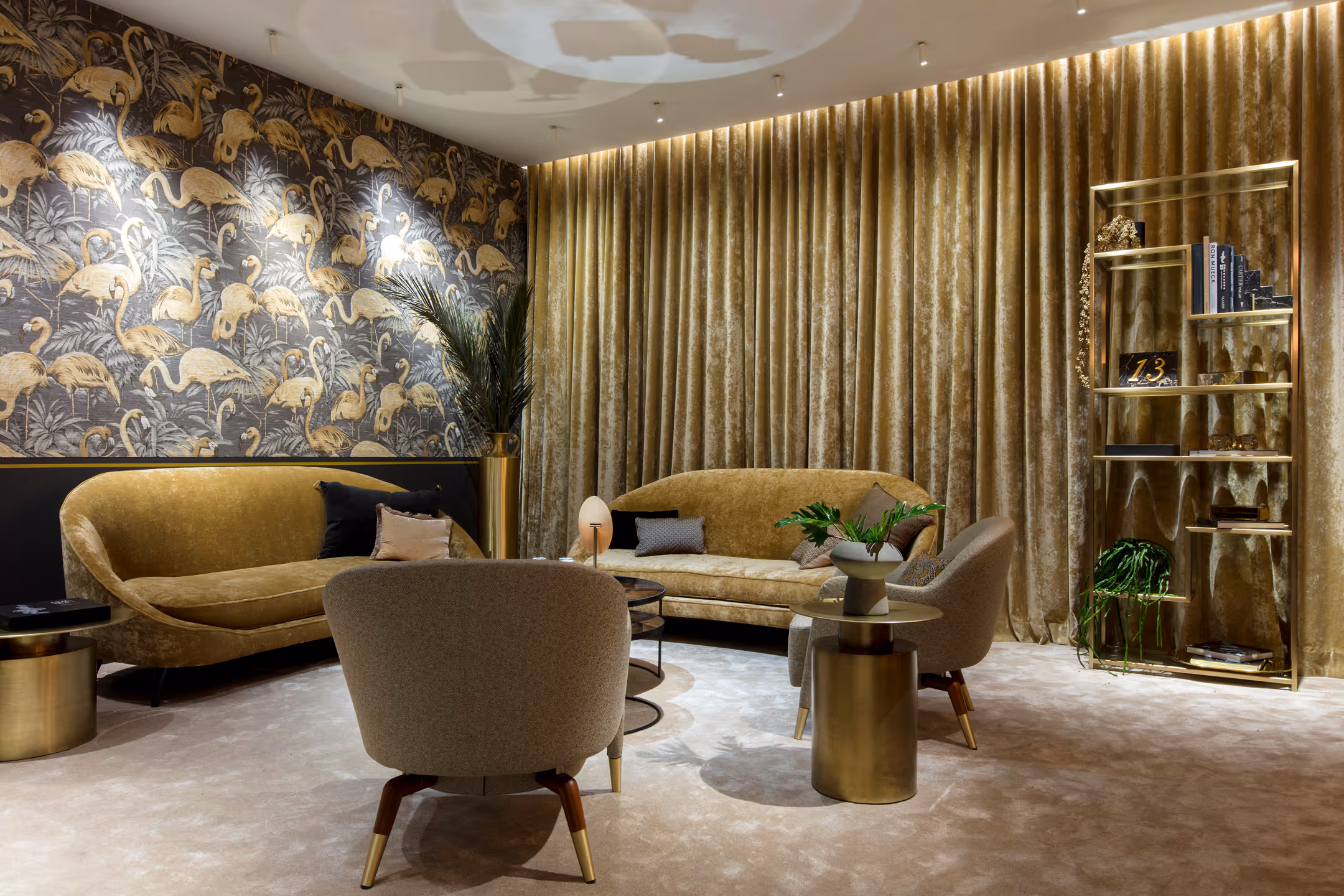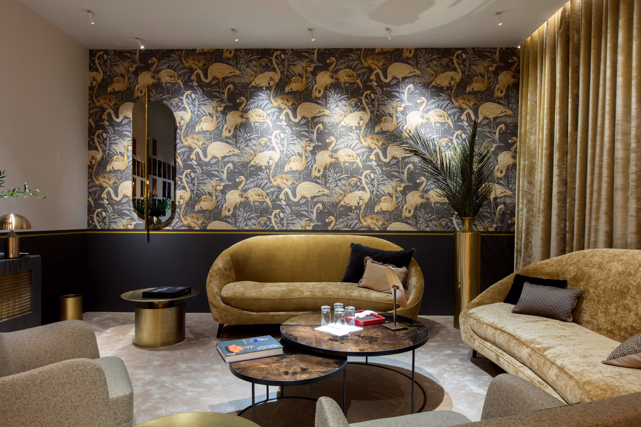 " Du papier peint et des rideaux, des couleurs chics, du mobilier d’éditeur, des jeux de lumière et la mise en scène des accessoires choisis avec soin donnent du ‘home feeling’ à chaque salon. "