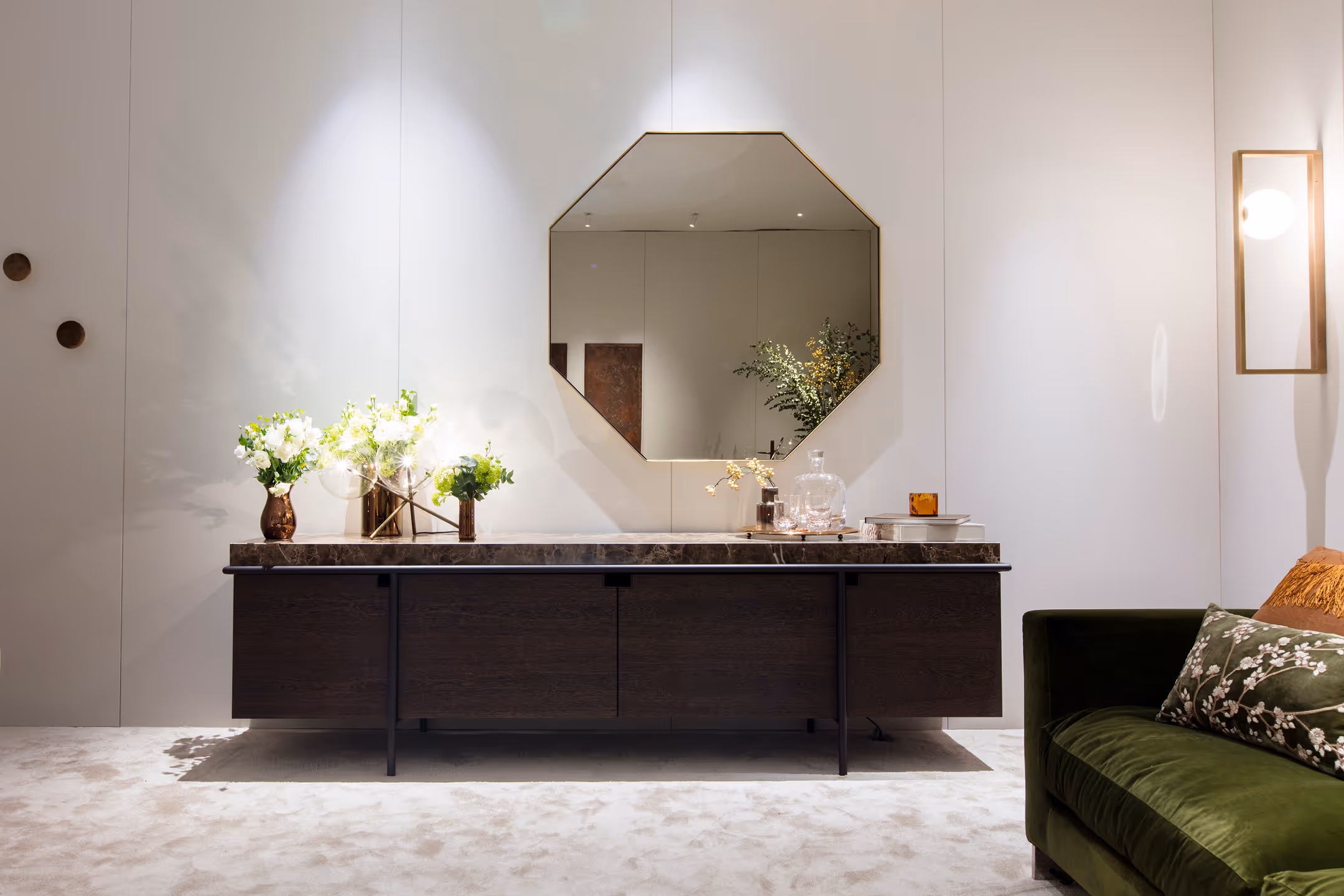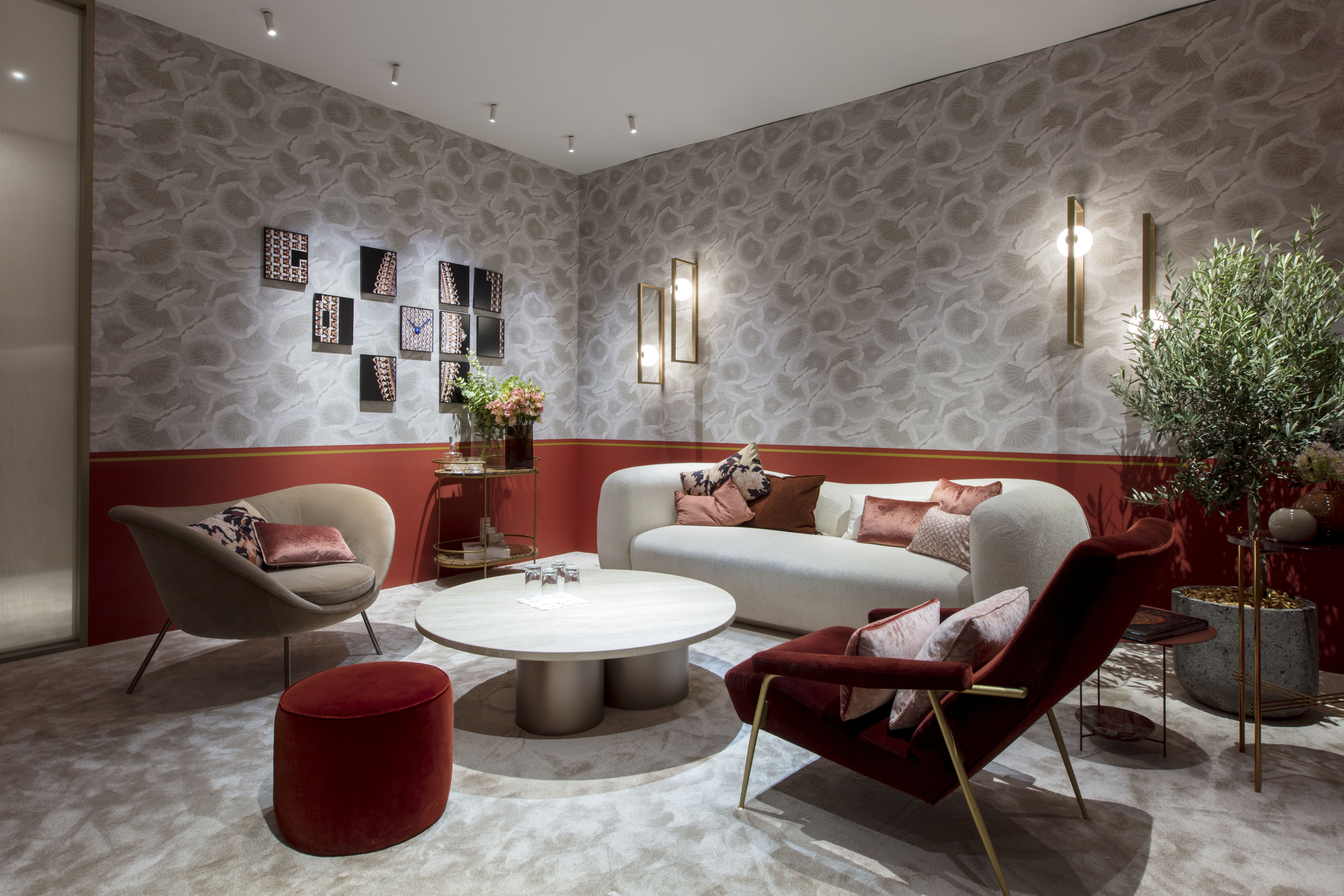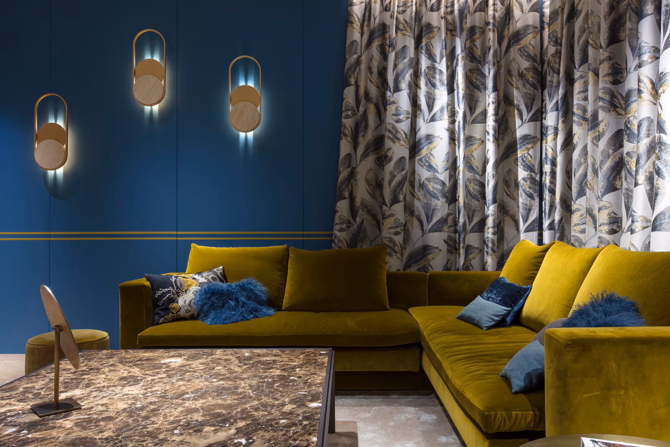 " Du papier peint et des rideaux, des couleurs chics, du mobilier d’éditeur, des jeux de lumière et la mise en scène des accessoires choisis avec soin donnent du ‘home feeling’ à chaque salon. "